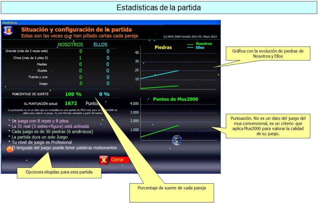 Al comenzar una partida de mus, aparece la siguiente pantalla, que muestra todos estos elementos: